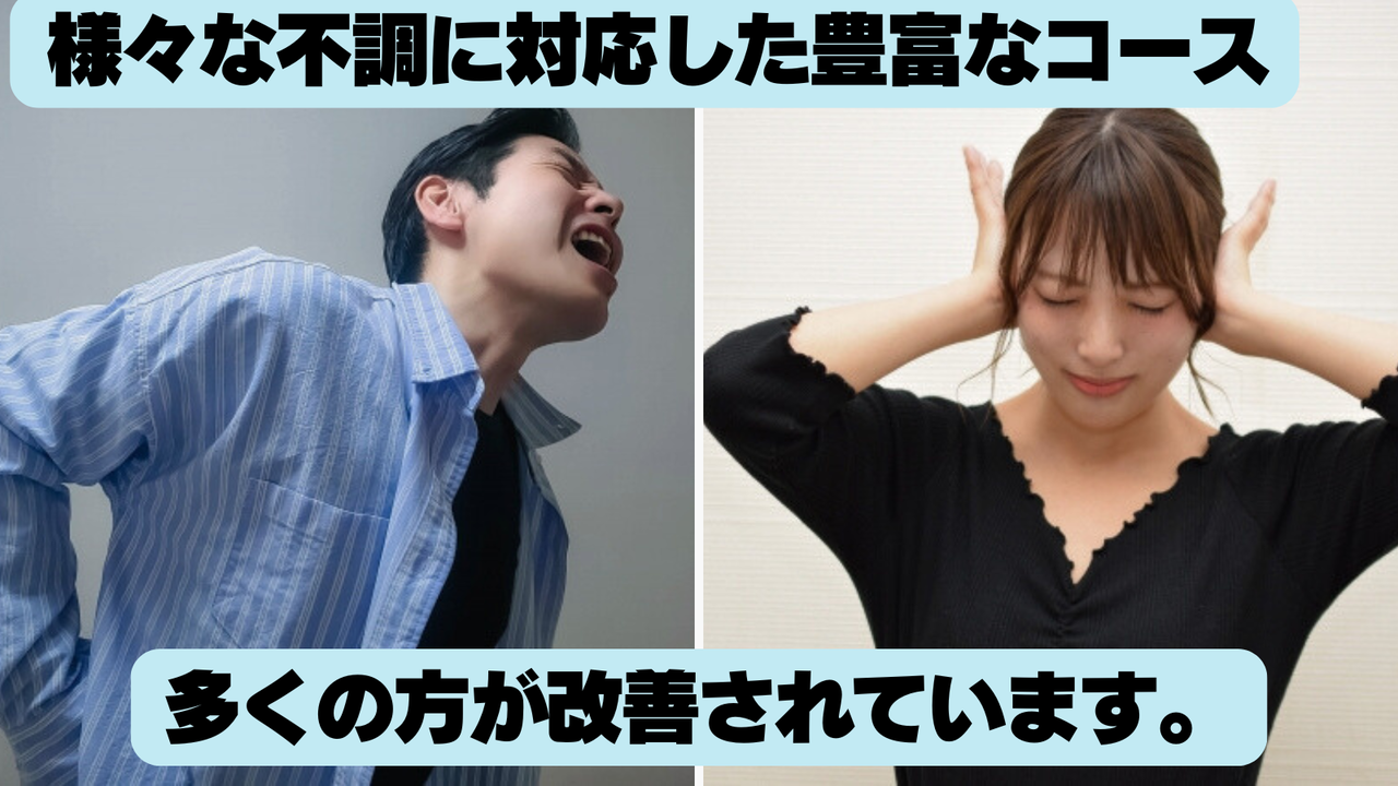 はじめてご来院の方は新規コースを選択してください。施術前にカウンセリングを行い、今の不調に合ったコースをご提案いたします。
