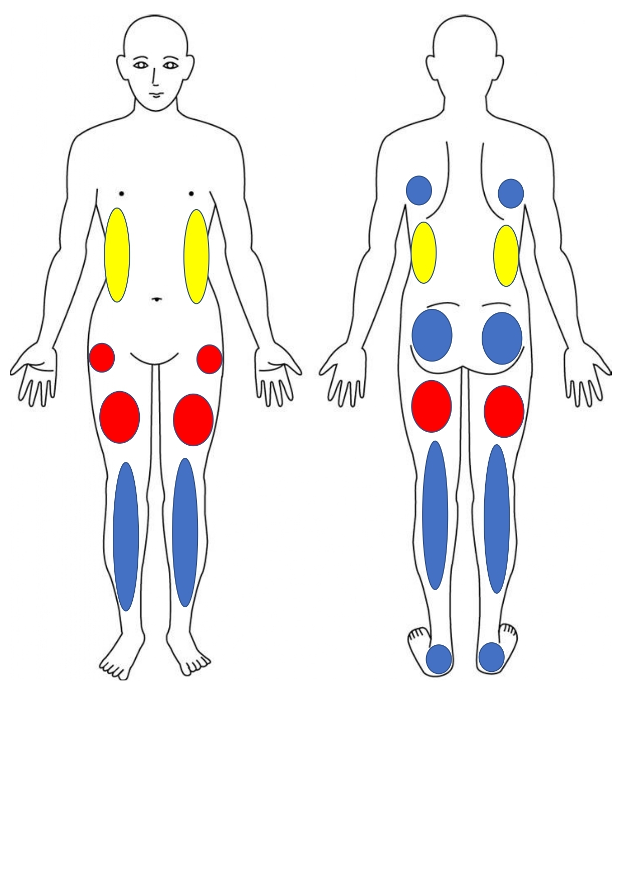 「疲労性腰痛」「ストレス性腰痛」「座骨神経痛」「椎間板ヘルニア」「脊柱管狭窄症」などなかなか改善できずに長く悩まれtる方を多く見受けられます。このような腰痛を改善させるために大切なことは腰痛のタイプを見極めて施術することです。赤い箇所に凝りがある方はストレス使いすぎが原因で、固まった凝りをほぐすことで改善されます。青い箇所に凝りがある方は冷え・老廃物が原因で、しっかり温めながらリンパの凝りを流すことで改善されます。黄色い箇所に凝りがある方はぎっくり腰体質なので黄色い箇所をほぐすのですが普段自宅で黄色い箇所に凝りができないように様々なアドバイスをさせていただきます。当院の腰痛専門施術で多くの方が改善されていますの、腰痛で悩まれている方は是非ご相談してください♬